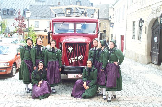 Trachtengruppe vor dem restaurierten Vomag LKW